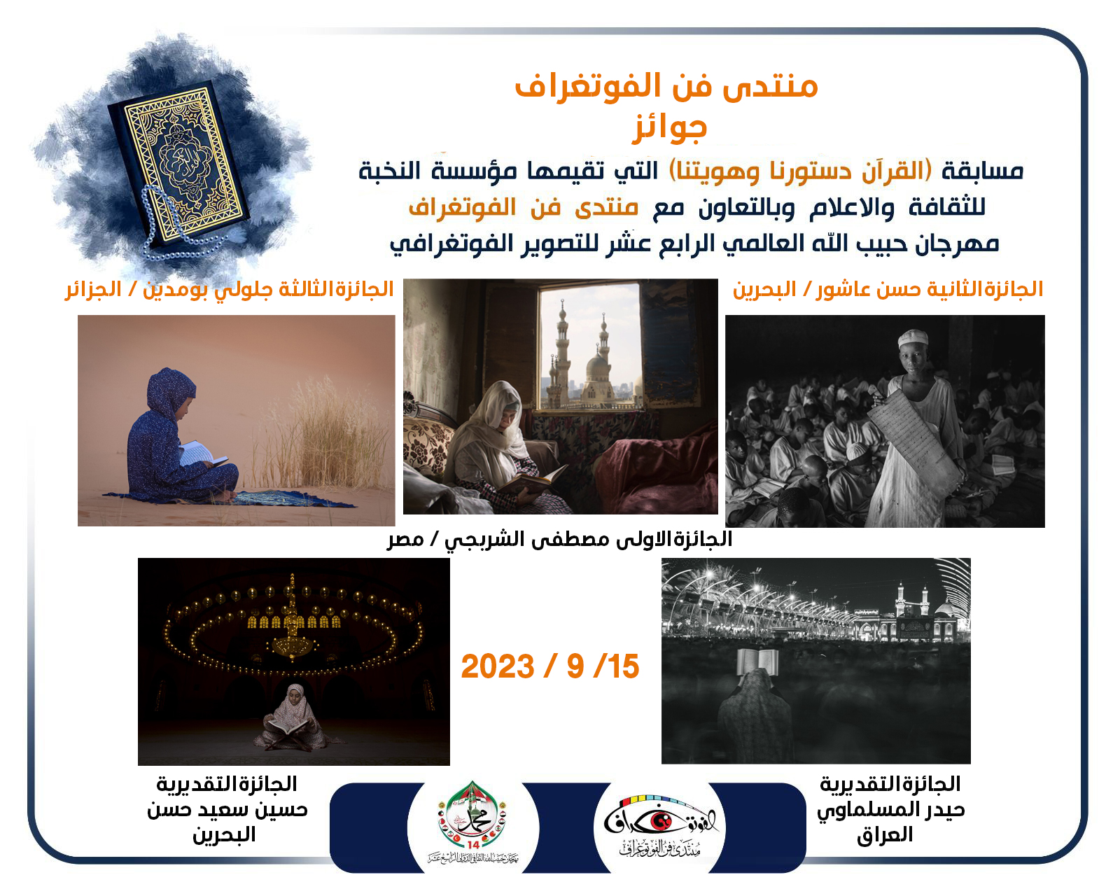 افتتح يوم امس الموافق الخامس عشر من ايلول معرض مسابقة مهرجان حبيب الله الثقافي العالمي الرابع عشر التي تقيمها مؤسسة النخبة للثقافة و الاعلام و بالتعاون مع منتدى فن الفوتغراف على قاعة السفراء الاربعة في حي سومر من قبل قائد شرطة محافة ذي قار و بحضور جمهور غفير من ابناء المحافظة و ضيوف المهرجان من محافظات ( بغداد و كربلاء المقدسة و بابل و البصرة و المثنى ) و تم اعلان جوائز المسابقة التي حفلت بمشاركة واسعة من المصورين العرب من مصر و الجزائر و المغرب و تونس و ليبيا و الاردن و لبنان و فلسطين و سوريا و البحرين و السعودية عمان و المصورين المقيمين في اوربا من السويد و الدنمارك و فلندا و فرنسا و كانت الجائزة الاولى من نصيب المصور الفوتغرافي ( مصطفى الشربجي من مصر ) و الجائزة الثانية ( حسن عاشور من البحرين ) و الثالثة ( جلولي بومدين من الجزائر ) و منحت لجنة الفرز و التحكيم المؤلفة من السادة ( عبد الرضا عناد – ايوب يوسف – رياض داخل – باسم المهدي – عقيل غانم – حيدر مطوس و وسام مناحي ) جائزتين تقديريتين الى المصور ( حيدر المسلماوي من العراق ) و المصور ( حسين سعيد حسن من البحرين ) و تميزت المسابقة لهذا العام باختيار محور ( القرآن دستورنا و هويتنا ) لنصرة القرآن الكريم بعد الهجمة الاخيرة في بعض الدول الاوربية و الاساءة الكبيرة للاسلام و المسلمين و اعلنت اللجنة المنظمة للمسابقة عن استلام ( 325 ) صورة فوتغرافية و بلغ عدد المشاركين ( 125 ) مصورا و تم عرض اربعون صورة فوتغرافية بحجم ( 40 × 60 ) و التي اختيرت من قبل لجنة الفرز و التحكيم .