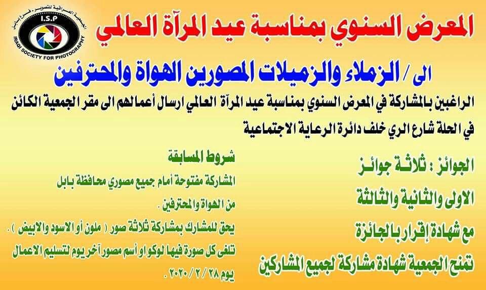 تقيم الجمعية العراقية للتصوير فرع بابل معرضها السنوي بمناسبة عيد المراءة العالمي و تخصص ثلاث جوائز لافضل الصور المشاركة يوم الثامن و العشرون من شهر شباط الجاري و المشاركة مفتوحة امام هواة و محترفي فن الفوتغراف العراقي .