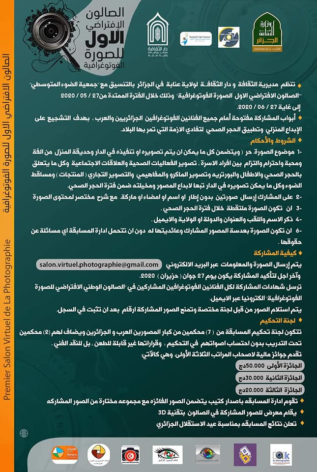 مسابقات عربية الصالون الافتراضي الاول في الجزائر الصالون الافتراضي الاول للصورة الفوتغرافية في الجزائر 0 160 شارك فيسبوكTwitterجوجل بلسReddItواتس ابباينتريستالبريد الإلكتروني