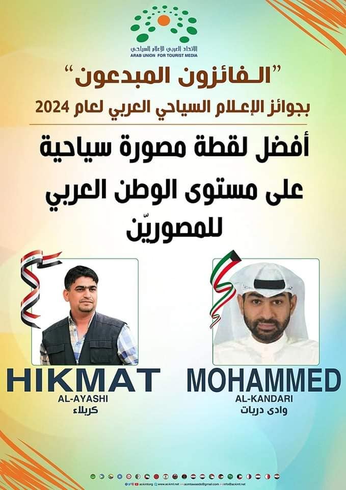 وفي فئة “أفضل لقطة مصورة سياحية”، شارك محمد الكندري بصورة “وادي دربات”، وحكمت العياشي بصورة “كربلاء”.