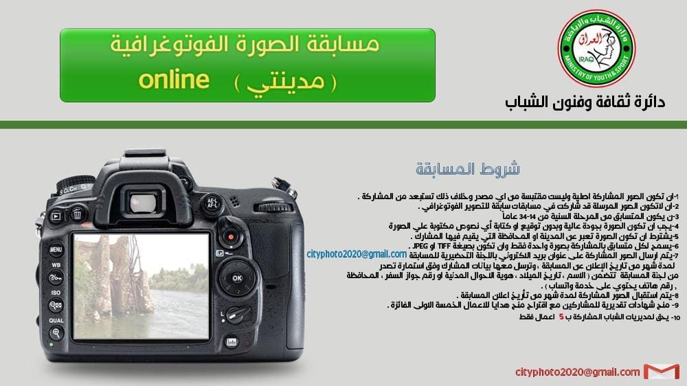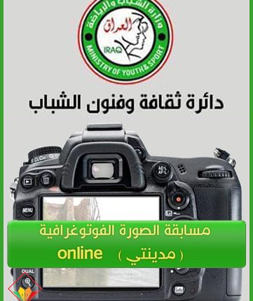 مسابقة التصوير الفوتوغرافي ( مدينتي) والتي تقيمها دائرة ثقافة وفنون الشباب في وزارة الشباب والرياضة. حيث ستجرى المنافسة في كل مديرية لاختيار افضل 5 صور لتشارك في المسابقة المركزية التي تقيمها الوزارة في بغداد بتقنية ( on line) وعلى الراغبين بالمشاركة ارسال الصور على الايميل المرفق .