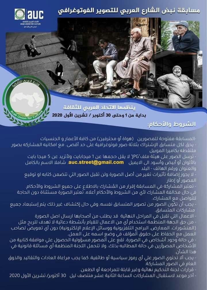 مسابقة نبض الشارع العربي للتصوير الفوتوغرافي، والتي ينظمها الإتحاد العربي للثقافة بالتعاون مع مجموعة من أكبر أساتذة فن التصوير الفوتوغرافي في المنطقة العربية و بجوائز عينية للفائزين مقدمة من شركة نيكون Nikon العالمية.