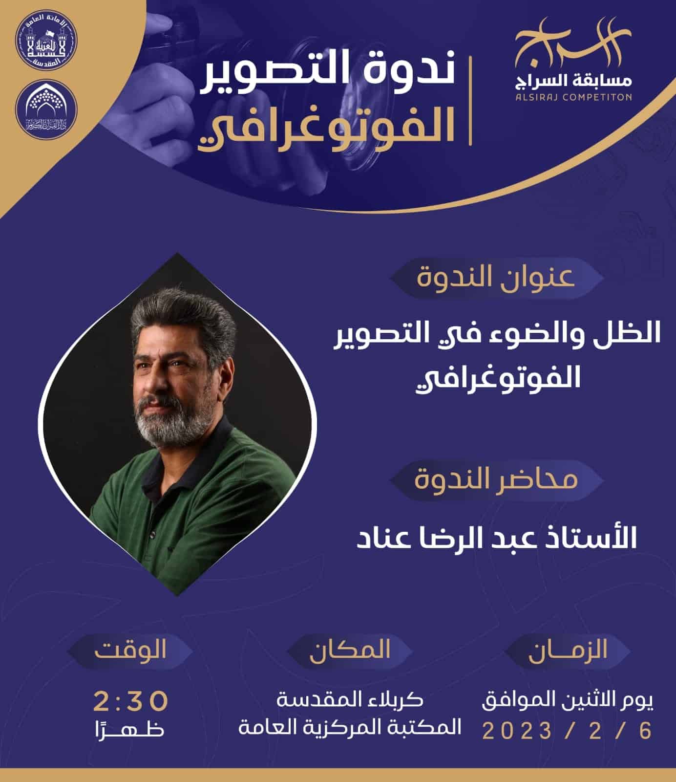 منتدى فن الفوتغراف ذي قار يشارك في افتتاح معرض مسابقة السراج الدولية الثانية للصورة الفوتغرافيةالتي نظمها قسم دار القرآن التابع للعتبة الحسينية المقدسة من 5 – 6 / 2 / 2023 على قاعة المكتبة المركزية في كربلاء المقدسة و اسفرت نتائج المسابقة عن فوز المصور مصطفى بشار الشربجي من مصر بالجائزة الأولى و فوز المصور مؤيد حسن آل ياسين من السعودية بالجائزة الثانية و فوز المصور بشير بن سونه من الجزائر بالجائزة الثالثة و حصول المصور العراقي معتز سامي على الجائزة التقديرية و المصور العراقي عمر حسين علي بجائزة لجنة التحكيم و تخلل المهرجان القاء ثلاث محاضرات قدمها الفنان الفوتغرافي رحيم السيلاوي عن تجربته الشخصية في الصورة العاشورائية والأستاذ عبد الرضا عناد رئيس مجلس إدارة المنتدى قدم محاضرة بعنوان الظل و الضوء في الصورة الفوتغرافية و اختتم المهرجان بمحاضرة للأستاذ حسين نجم عن أهمية النقد في التصوير الفوتغرافي و تميز المهرجان بحضور عدد كبير من المهتمين بشؤون الفوتغراف العراقي من محافظات بغداد و الانبار و النجف الاشرف و بابل و ذي قار و واسط و ميسان و البصرة و المثنى و الديوانية بالإضافة الى عدد كبير من مصوري كربلاء المقدسة  .