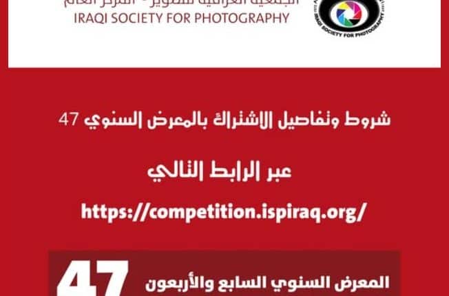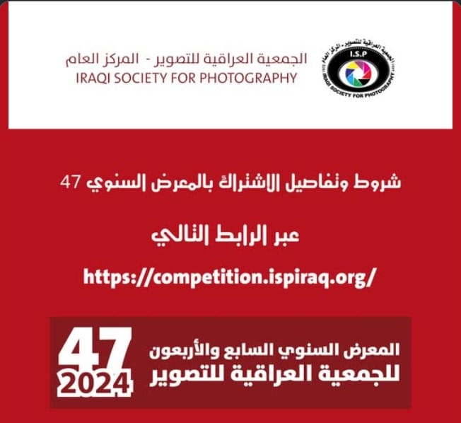 يسر الهيئة الادارية للجمعية العراقية للتصوير / المركز العام – بغداد دعوة جميع المصورين العراقيين الفوتوغرافيين من الهواة والمحترفين من أعضاء الجمعية ومن خارجها للمشاركة في (معرضها السنوي السابع والاربعون) للصور الفوتوغرافية.